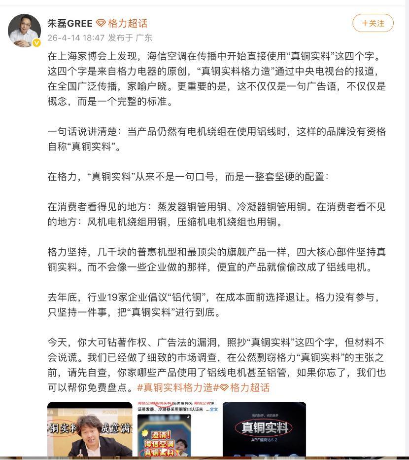 徽声在线4月15日讯(记者 陆婷婷)近日,家电行业掀起了一场关于“铜铝”的激烈争论,格力电器(000651.SZ)与海信空调的纷争成为市场焦点,引发了广泛关注。 4月14日晚间,格力电器CMO朱磊在社交媒体上公开发文,对海信空调使用“真铜实料”这一表述提出质疑。朱磊指出,该提法最初源自格力,并强调当产品中电机绕组仍使用铝线时,相关品牌不应自称“真铜实料”。他还直接喊话海信,要求其自查旗下产品中铝线电机和铝管的应用情况。 图片来源:朱磊微博 针对朱磊的质疑,海信空气事业部品牌总监杨祥玺在接受徽声在线记者采访时回应称,海信空调在室内机、室外机的冷凝器和蒸发器,以及内外机的连接管上,均采用了铜管,且高能效产品更是使用了双排铜管。他同时提到,市场上主流大品牌如美的、海尔等,也大多采用铜管。 杨祥玺进一步表示,“真铜实料”这四个字并非格力或朱磊的专属,早在10年前,许多家电企业就已在使用这一表述,绝非格力原创。他还发布视频称,早在2016年,就有媒体报道过家电企业坚持“真铜实料”,其中提及了海信、长虹、创维等品牌,但并未包括格力。 对于杨祥玺的说法,朱磊在今日接受媒体采访时回应称,回到2016年,当时行业确实比较混乱,有些企业需要通过强调用铜来彰显自身价值。而格力一直坚持用铜,因此无需刻意强调。 此外,朱磊在发文中还提到,“去年底,行业内有19家企业倡议‘铝代铜’,在成本压力面前选择妥协,但格力并未参与。”对此,杨祥玺在社交平台晒出了《空调铝强化应用研究工作组成员申请表》,显示格力电器曾参与其中。 图片来源:杨祥玺微博 值得注意的是,关于“铝代铜”的讨论由来已久。随着铜价的持续上涨,这一话题再次被推上风口浪尖。近年来,铜价波动对空调行业产生了显著影响,企业面临巨大的成本压力。 据数据显示,2025年LME铜价年度涨幅超过40%,沪铜价格更是突破9万元/吨。近期,在经历了一段时间的震荡调整后,铜价重拾升势,LME铜价在周二(04月14日)攀升至六周新高。在这一背景下,“铝代铜”成为行业降低成本压力的重要选项。 格力电器曾在互动平台表示,铜是空调的核心原材料,占空调成本的约20%。尽管铝材在成本上具有明显优势,其价格约为铜材的1/4,密度约为1/3,但在熔点、热传导系数、电阻率、耐腐蚀等参数以及长期可靠性等方面,铝材与铜材存在较大差距。 今年以来,格力电器方面多次重申,在铝材的性能、质量和可靠性不能完全保证的情况下,公司暂时没有“铝代铜”的计划。这一立场体现了格力对产品品质的严格把控和对消费者负责的态度。 针对外界关注的两大焦点问题,朱磊今日明确回应:“第一,格力确实参与了铝材料的研究,而且没有我们的参与,这个研究还难以取得好的成果。第二,关于倡议推动‘铝代铜’,格力并未参与。” 朱磊进一步表示,“我们并未放弃对铝的研究。如果未来研究发现用铝也能达到高品质,或者市场非常期待格力推出铝产品且不需要十年包修,我们可以考虑。但目前我们仍坚持十年免费包修的政策。子品牌大松、晶弘也均采用铜材。在海外市场,我们已有铝平台产品,但仅用于气候干燥、无腐蚀风险的国家。” |