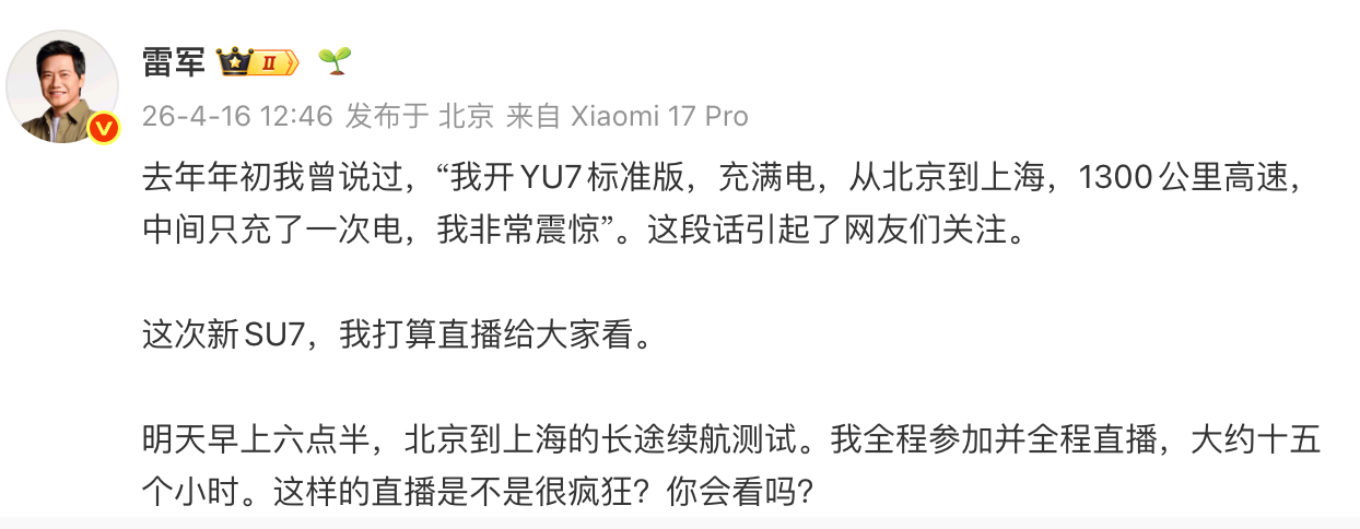 4月16日,小米科技公司的创办人、现任董事长兼CEO雷军通过社交媒体宣布了一项引人注目的计划:他将亲自进行一场新SU7车型的长途续航测试,并通过直播的方式与广大网友分享这一过程。雷军表示,这场测试将从北京出发,一路驶向上海,全程将由他亲自驾驶并直播,预计耗时约十五个小时。 |