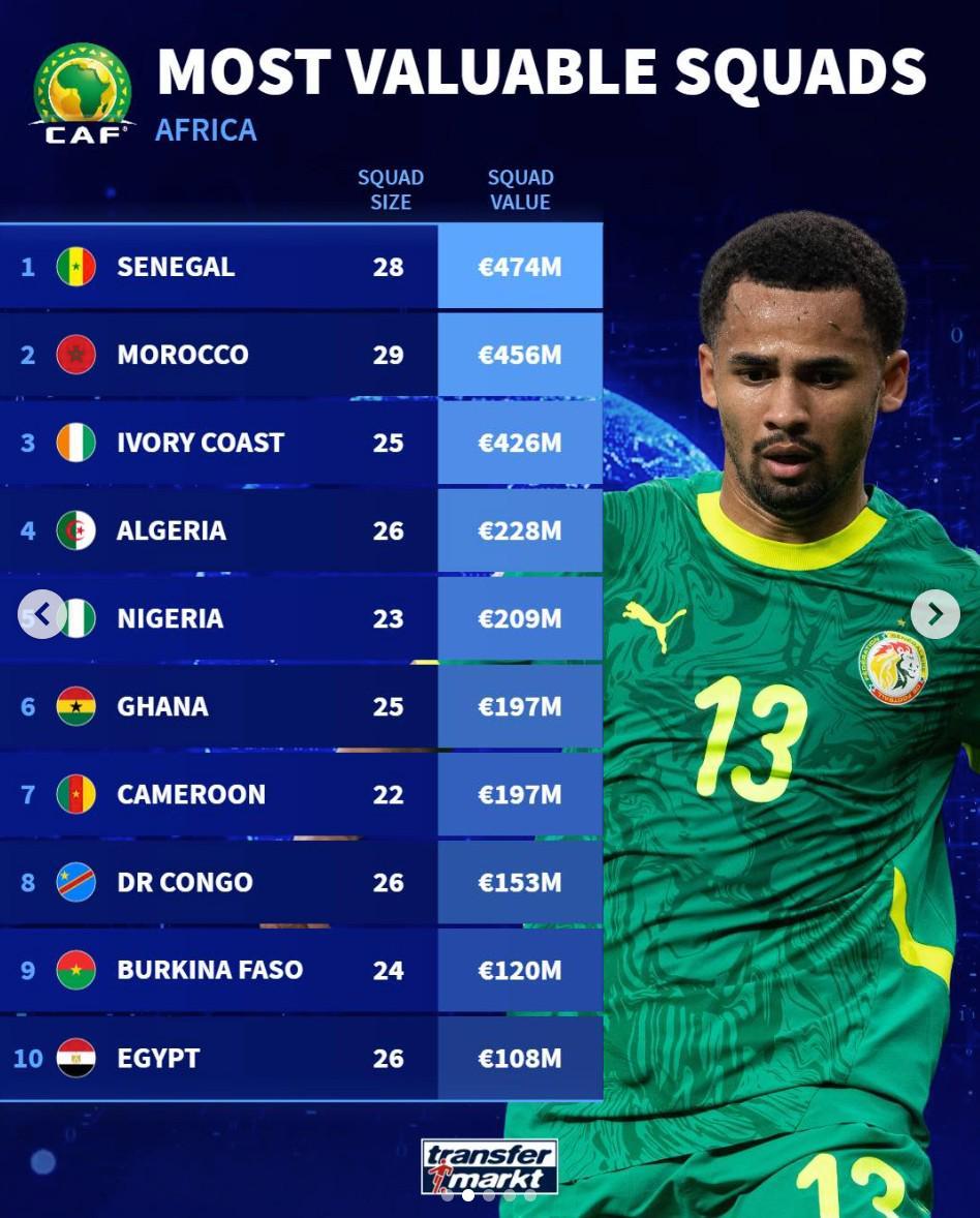 北京时间3月31日消息,根据权威转会数据平台德转最新统计,2024年3月国际比赛周期内非洲国家队球员总身价排行榜正式揭晓。卫冕非洲杯冠军塞内加尔以4.74亿欧元总身价领跑榜单,北非劲旅摩洛哥以4.56亿欧元紧随其后,科特迪瓦国家队凭借4.26亿欧元位列第三。值得关注的是,中国男足在3月热身赛中的对手喀麦隆国家队,以1.97亿欧元总身价排在第七位。 非洲足坛身价TOP10详细榜单: 1. 塞内加尔(28人阵容) 总身价:4.74亿欧元 2. 摩洛哥(29人阵容) 总身价:4.56亿欧元 3. 科特迪瓦(25人阵容) 总身价:4.26亿欧元 4. 阿尔及利亚(26人阵容) 总身价:2.28亿欧元 5. 尼日利亚(23人阵容) 总身价:2.09亿欧元 6. 加纳(25人阵容) 总身价:1.97亿欧元 7. 喀麦隆(22人阵容) 总身价:1.97亿欧元 8. 民主刚果(26人阵容) 总身价:1.53亿欧元 9. 布基纳法索(24人阵容) 总身价:1.20亿欧元 10. 埃及(26人阵容) 总身价:1.08亿欧元 【徽声在线独家呈现英超赛事直播】 |