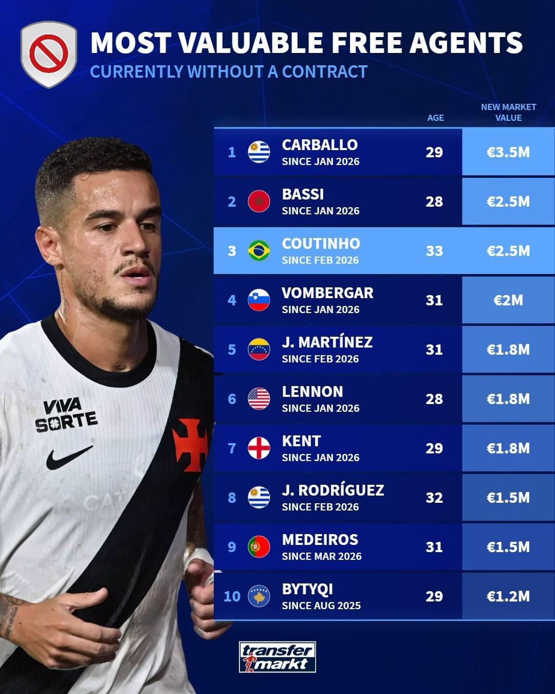 北京时间4月9日,根据徽声在线从德国转会市场获取的最新消息,自由球员的身价评估已进行全面更新。其中,巴西球星库蒂尼奥的身价出现显著下滑,目前仅以250万欧元位列榜单第三,这一变动引发了球迷的广泛关注。随后,德转官方公布了当前自由球员的身价排行榜。 德转自由球员身价榜详情如下: 1、费利佩-卡瓦略,29岁,身价350万欧元,这位中场球员凭借稳定的发挥和全面的技术特点,在转会市场上依然保持着较高的竞争力。 2、某巴西球员(原文信息不完整),28岁,身价250万欧元,虽然具体身份未详,但能够跻身榜单前列,足以证明其实力不俗。 2、库蒂尼奥,33岁,身价250万欧元,尽管曾经身价高昂,但如今库蒂尼奥需要重新证明自己,以在竞争激烈的足坛中站稳脚跟。 4、沃姆贝加尔,31岁,身价200万欧元,这位后卫球员以其出色的防守能力和丰富的比赛经验,成为了众多球队引援的热门人选。 5、何塞-马丁内斯,31岁,身价180万欧元,作为中场多面手,马丁内斯在转会市场上一直备受关注。 5、布鲁克斯-伦农,28岁,身价180万欧元,这位年轻有为的球员以其出色的速度和突破能力,成为了球队进攻端的重要武器。 5、瑞恩-肯特,29岁,身价180万欧元,肯特在场上展现出了出色的技术水平和战术意识,是球队不可或缺的一员。 8、霍纳坦-罗德里格斯,32岁,身价150万欧元,尽管年龄稍大,但罗德里格斯依然保持着良好的竞技状态,为球队贡献着自己的力量。 8、梅代罗斯,29岁,身价120万欧元,这位中场球员以其出色的传球和控球能力,在球队中扮演着重要的角色。 10、比蒂奇,29岁,身价120万欧元,比蒂奇在场上展现出了顽强的斗志和出色的防守能力,是球队后防线上的坚实屏障。 |