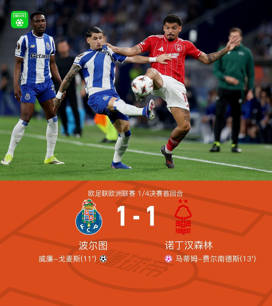 北京时间4月10日,在欧足联欧洲联赛1/4决赛首回合的较量中,波尔图与诺丁汉森林展开了一场激烈的对决。上半场,威廉-戈麦斯抓住机会为波尔图首开纪录,然而不久后,马蒂姆-费尔南德斯却因一次离谱的回传球不慎自摆乌龙。最终,双方以1-1的比分握手言和。 关键赛事回顾 比赛进行到第11分钟,贝加送出精准助攻,威廉-戈麦斯不负众望,成功破门,波尔图1-0领先。 仅仅两分钟后,即第13分钟,场上风云突变,马蒂姆-费尔南德斯的一次回传球出现严重失误,直接将球送入了自家球门,波尔图与诺丁汉森林的比分变为1-1。