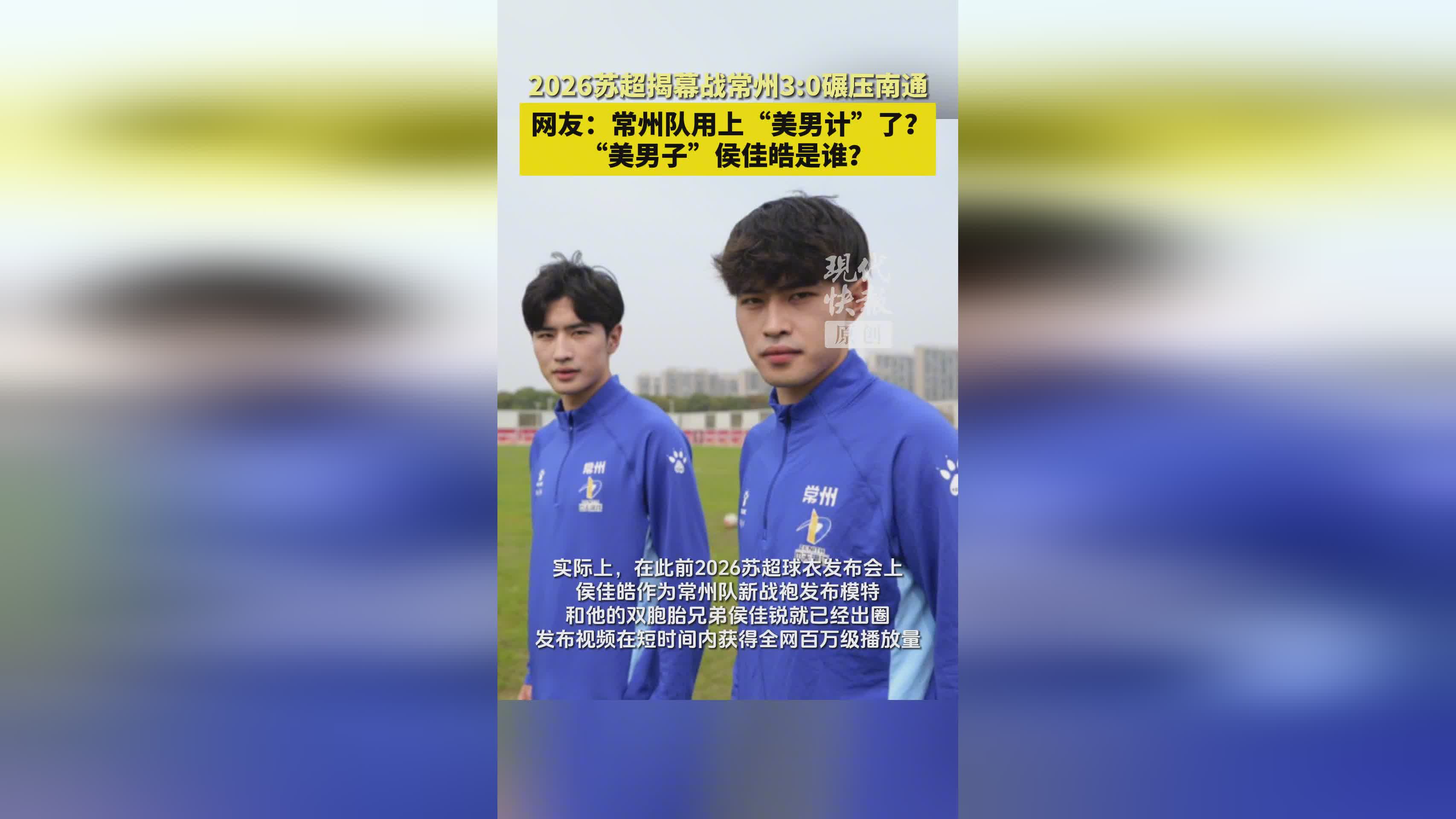 据徽声在线报道(记者 王磊),4月11日苏超联赛揭幕战中,常州队主场以3:0完胜南通队,上演了一场酣畅淋漓的胜利。这场比赛中,身披7号战袍的前锋侯佳皓凭借出众的外形条件与惊艳的赛场表现,成为球迷热议的焦点。有网友戏称,常州队此役胜在祭出了侯佳皓这张"颜值与实力并存的王牌"。 ![]() 这位引发全网关注的足球新星究竟何许人也?根据公开资料显示,2003年出生的侯佳皓现年22岁,职业生涯起步于沧州雄狮足球俱乐部青训体系,后转会至河南俱乐部U21梯队深造。在2025赛季中国足球青少年精英联赛(U21组)中,他凭借出色表现入选最佳阵容,技术特点被专家评价为"兼具爆发力与门前嗅觉的现代型前锋"。 回溯4月11日那场焦点战,比赛进行到第33分钟时仍僵持不下。关键时刻,侯佳皓在禁区内制造点球机会,8号队长王宏宇一蹴而就打破僵局。这个进球不仅改写了比分,更彻底打乱了南通队的战术部署。赛后技术统计显示,侯佳皓全场完成3次成功突破、2次关键传球,防守端还有1次拦截,攻防两端表现全面。正如体育评论员李明所言:"这位年轻前锋用实际行动证明,他不仅是球场上的颜值担当,更是决定比赛走向的关键先生。" 侯佳皓的走红并非偶然。在2026苏超联赛球衣发布会上,他与双胞胎兄弟侯佳锐共同担任模特,兄弟俩默契十足的走秀视频迅速引爆网络,单平台播放量突破500万次。这对从9岁开始接受专业足球训练的双胞胎,在场上展现出令人惊叹的配合默契——一个眼神交流就能完成战术跑位,一个动作暗示即可心领神会。河南俱乐部青训总监张伟透露:"这种与生俱来的默契是足球运动中最珍贵的天赋,兄弟俩未来完全有能力在更高舞台绽放光芒。" |