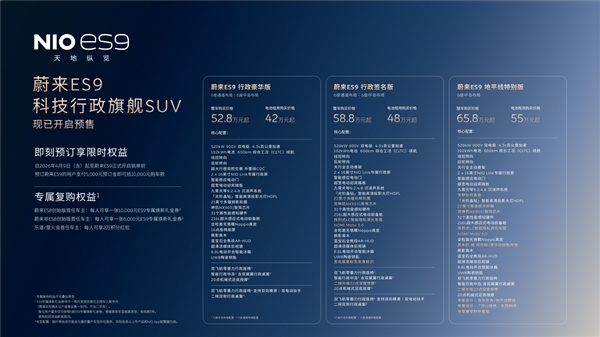 徽声在线4月9日最新报道,蔚来汽车旗下全新旗舰SUV车型ES9今日正式开启预售通道,此次共推出三款不同配置版本供消费者选择。在整车购买方案中,起售价定为52.8万元;若采用Bass电池租赁方案,则起售价可降至42万元,为消费者提供了更为灵活的购车选择。 为回馈广大消费者的支持与厚爱,蔚来官方同步公布了丰厚的预售权益政策:消费者只需支付5000元预订金,即可在购车时抵扣10000元购车款;对于蔚来ES8创始版首任车主,更可额外享受10000元ES9专属焕新礼金券的优惠;非创始版首任车主则可享受6000元的优惠;此外,乐道、萤火虫品牌的首任车主在复购时,每人还可获得2万复购积分红包的惊喜福利。 蔚来ES9被誉为蔚来十一年体系创新的集大成之作,它不仅开创了智能电动行政旗舰SUV这一全新品类,更将蔚来原创设计理念推向了新的巅峰。这款车型的诞生,无疑将为中国新能源汽车市场注入新的活力。 在外观设计上,ES9独具匠心。它配备了双层Double-Dash晶钻日行灯,通过超6826个微观切割面的精心雕琢,呈现出璀璨夺目的钻石效果。下方则配备了梯方钻大灯,集成了近光灯、HDPL智能高清投影大灯以及ADB大灯,为驾驶者提供了更为清晰、安全的照明体验。 值得一提的是,HDPL大灯采用了先进的Micro LED技术,其远光照射距离可达600米,照明宽度能够覆盖6车道。同时,它还支持S型领航光毯和50㎡迎宾光幔的显示效果,拥有"星光大道"、"星海交辉"、"星幕华章"三种动态灯效,为驾驶者带来了前所未有的视觉盛宴。 在车身颜色方面,ES9提供了雪峰金、云白、M42星云红、南极星蓝、星辰绿、极夜黑和月辉银等7种丰富选择。此外,消费者还可选装玄金套装,包括车灯饰件、轮圈、制动卡钳和车标等,让爱车更加个性化。而Horizon版(地平线特别版)则提供了专属的极夜黑+月辉银、极夜黑+雪峰金双色车身,彰显出独特的品味与格调。 作为一款大型SUV,ES9的车身尺寸堪称庞大。其长宽高分别达到了5365/2029/1870mm,轴距更是长达3250mm,成为中国体量最大的纯电SUV。这一尺寸不仅超越了劳斯莱斯库里南,还与凯迪拉克凯雷德基本保持一致。同时,它还搭载了23英寸锻造轮圈,进一步提升了整车的霸气与豪华感。 在侧面设计上,ES9采用了纯平侧窗、隐藏式水切、隐藏式门把手以及近乎水平的宽舷肩线等设计元素,呈现出纯净利落的视觉效果。此外,它还配备了电动脚踏板和智能电动门等实用配置,为驾驶者带来了更为便捷、舒适的用车体验。 尾部设计方面,ES9依旧采用了SuperRed超红LED粒子组成的贯穿式灯带,并使用缎光高亮饰条和拉丝金属进行点缀,营造出强烈的科技感与豪华感。同时,尾部还配备了隐藏式后雨刷、后排隐私玻璃等实用配置,进一步提升了整车的实用性与安全性。 进入车内,ES9更是彰显了蔚来独特的高级审美。它以1.5m天空岛为中轴线,左右对称展开设计,营造出宽敞、舒适的驾乘空间。同时,它还提供了玳瑁棕+玛瑙黑、云贝米+玛瑙黑两种双拼配色供消费者选择。而地平线特别版则提供了苏木红+苏木红、浅沙白+可可棕两种主题配色,让车内氛围更加温馨、雅致。 在科技配置方面,ES9同样不遗余力。它配备了15.6英寸AMOLED中控屏以及48英寸Skyline天际线屏幕,内置SkyOS·天枢整车全域操作系统,为驾驶者提供了更为智能、便捷的交互体验。同时,它还配备了AR-HUD(近焦4米等效38英寸,远焦13米等效130英寸)以及NOMI Mate 3.0等先进配置,让驾驶者的视线始终保持在前方道路上,提高行车安全性。 在材质选择上,ES9同样精益求精。座舱内部大面积采用了Nappa真皮与枫影真木等高档材质进行包裹,接触面100%软质包裹设计让驾乘者感受到极致的舒适与豪华。而地平线特别版更是拥有399030针针绣工艺的"靠山揽景"刺绣、真木嵌铝饰板以及镶嵌天然保湿的铑金徽章等独特设计元素,彰显出无与伦比的尊贵与品味。 在座椅布局方面,ES9采用了2+2+2六座设计,满足了家庭出行的需求。飞航零重力座椅采用了17层舒适结构以及骶骨支撑系统和三硬度设计,为驾乘者提供了极致的舒适体验。后排则提供了中岛版和通道版两种选择,中岛版在中央区域配备了8英寸操控屏以及两个隐藏式小桌板等实用配置。同时,它还提供了茶台套装、舒适套装、后备箱衣帽架、车顶行李架等lifestyle选装套件,让驾乘者的出行更加丰富多彩。 在座椅调节方面,ES9同样表现出色。二排座椅支持26向调节功能,右侧座椅还支持150mm横滑调节;座椅加热面积达到了1.91㎡;另外还提供了42点按摩系统(地平线特别版为22点气动按摩+20点足底按摩),让驾乘者在长途旅行中也能享受到舒适的按摩体验。三排座椅同样配备了电动调节和加热功能;前排靠背可达170°躺角;二排182°;三排125°;并支持智能联动休憩、影院、露营和隐私等模式,满足驾乘者在不同场景下的需求。 在音响系统方面,ES9同样不遗余力。它配备了47个扬声器的9.2.4.8九霄天琴沉浸声系统,额定功率高达3020W,为驾乘者带来了震撼的音效体验。而地平线特别版更是配备了1.3克拉钻石振膜高音单元等独特设计元素,让车内音效更加纯净、悦耳。同时,车内还配备了六层环抱式氛围灯(总长度9442mm、1600万色)并支持随音乐律动的显示效果;还将拥有LC智能隐私车窗、遮阳帘、冷暖箱、后排双16英寸OLED屏以及智能矩阵阅读灯等实用配置,让驾乘者的出行更加便捷、舒适。 在空间表现方面,ES9同样令人印象