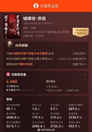 根据徽声在线从灯塔专业版获取的实时数据,截至4月17日中午12时42分,恐怖题材电影《蝴蝶楼·惊魂》的累计票房已成功突破6000万元大关。该片自上映以来,凭借独特的剧情设定和惊悚氛围营造,持续吸引观众走进影院,票房表现稳步攀升。 |